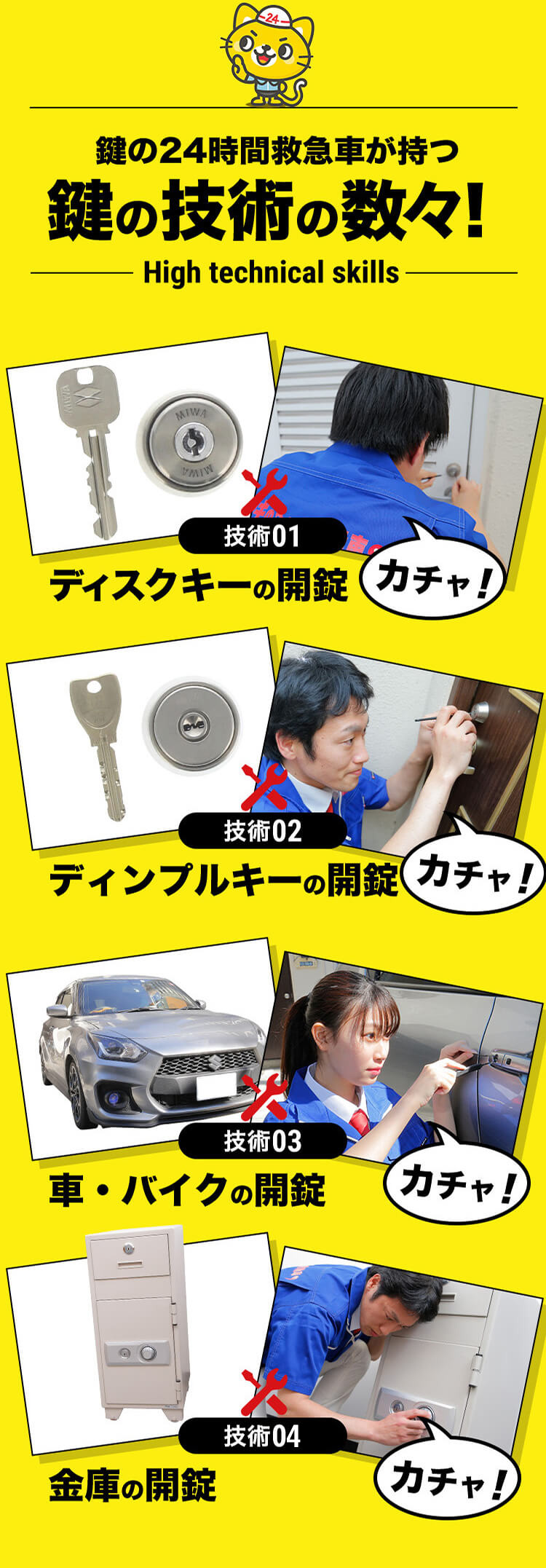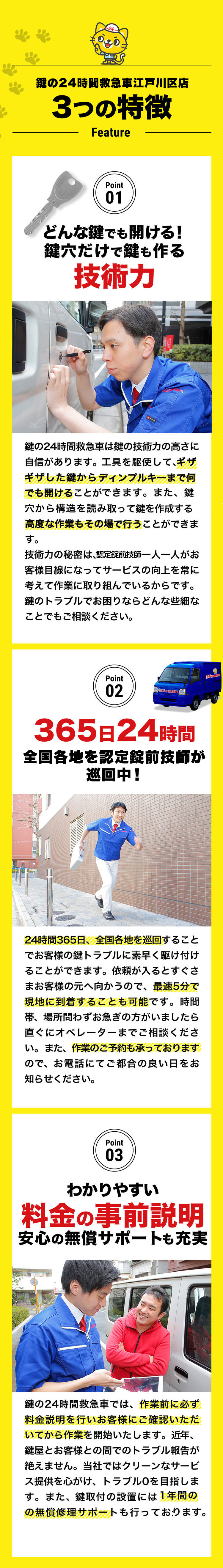 江戸川区の「カギの出張24時間」は、葛西、小岩エリアの鍵トラブルに24時間対応。地域の皆様が安心して日常を過ごせるよう、親切丁寧な対応と清潔な作業服を心がけています。お客様からの直接的なフィードバックを受け、サービス向上を目指します。