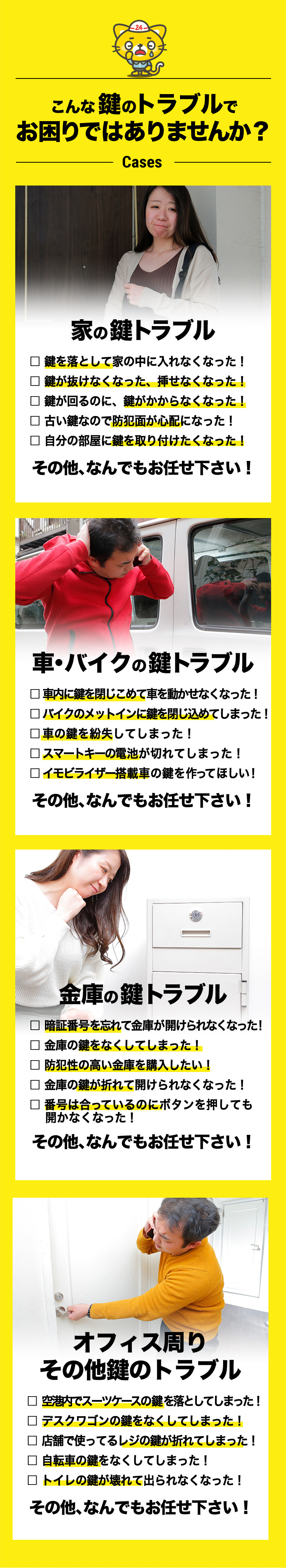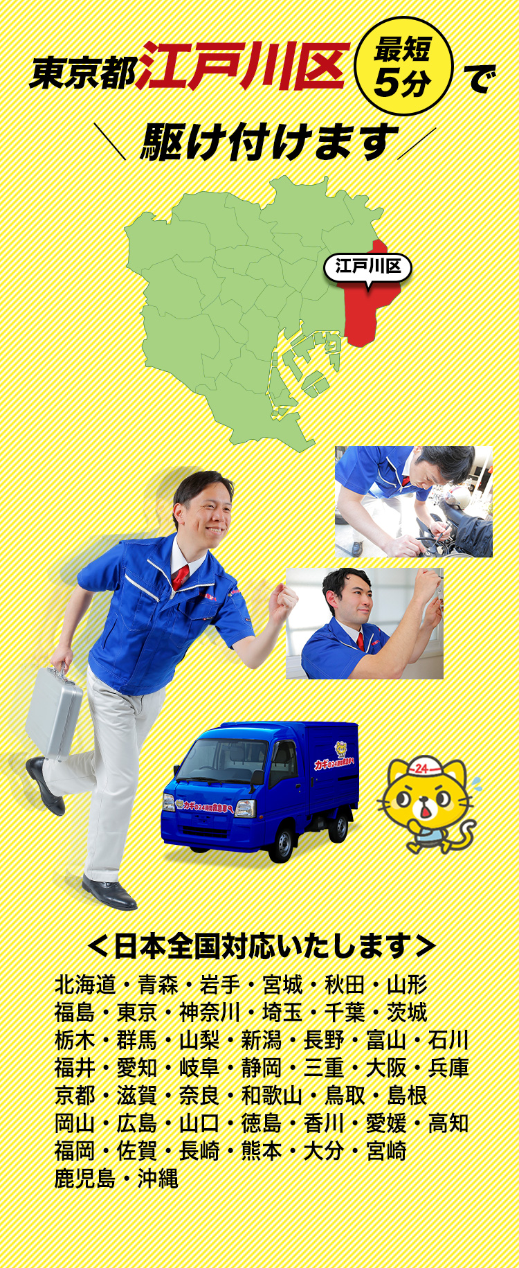 江戸川区の「カギの出張24時間」は、葛西、小岩エリアの鍵トラブルに24時間対応。地域の皆様が安心して日常を過ごせるよう、親切丁寧な対応と清潔な作業服を心がけています。お客様からの直接的なフィードバックを受け、サービス向上を目指します。